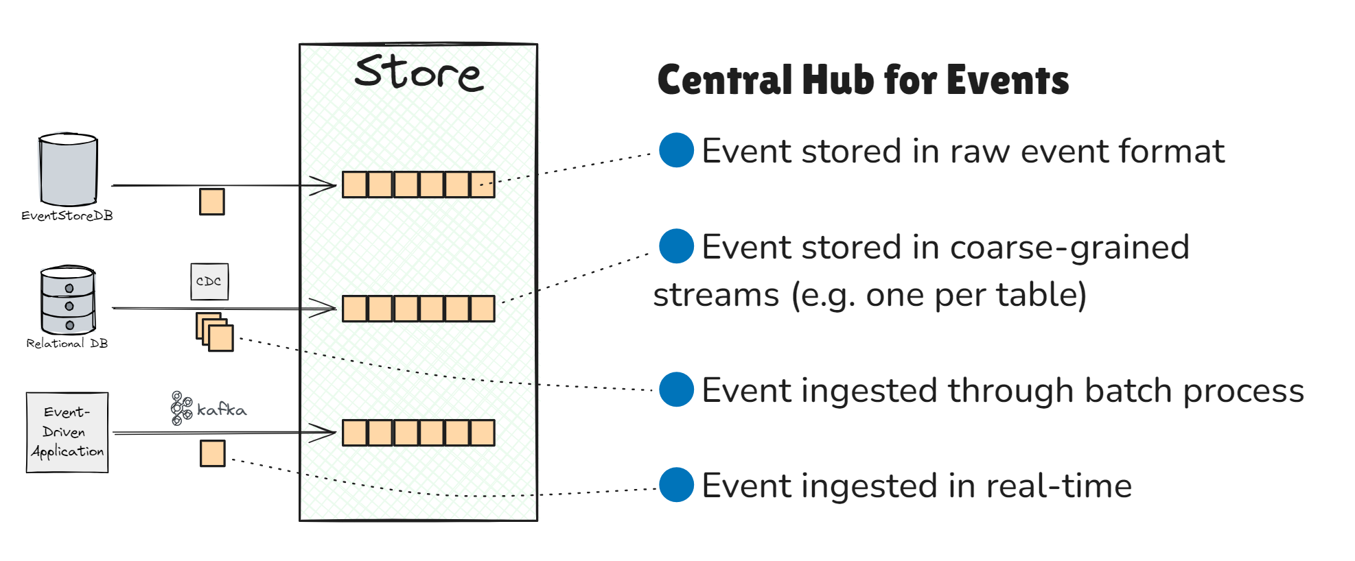 EventStoreDB acts as a hub for events from multiple data sources, storing all events in an immutable log, ensuring:
